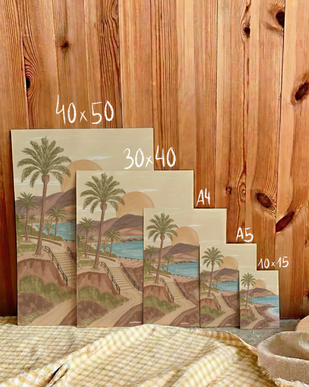 Medidas:   A2 (Ancho 40cm / Alto 50cm) A3 (Ancho 30cm / Alto 40cm) A4 (Ancho 21cm / Alto 29,7cm) A5 (Ancho 14,8cm / Alto 21cm) Postal (Ancho 10cm / Alto 15cm)